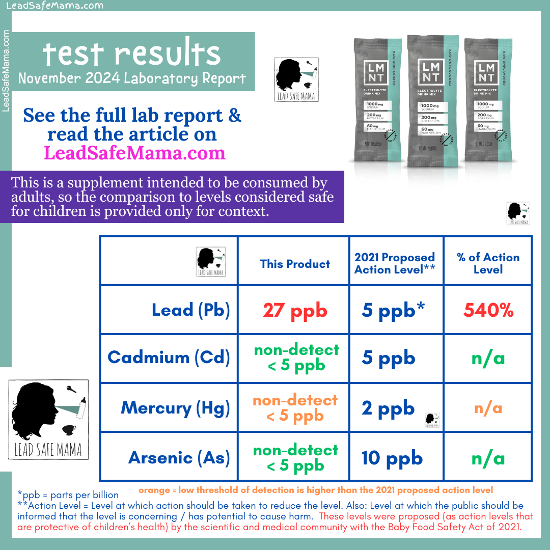 According to Tamara Rubin’s latest report, the Raw Unflavored version of LMNT electrolytes that they tested had higher-than-safe-for-children amounts of lead.